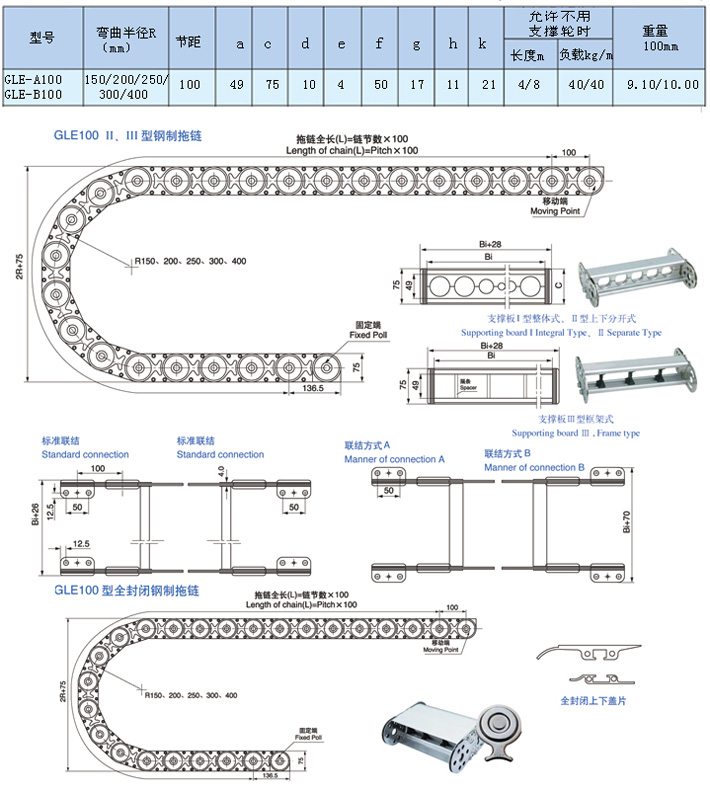 TLG100III框架式鋼制拖鏈,節(jié)距100mm,彎曲半徑可分150/200/250/300,最小寬度60mm,內(nèi)徑高度45mm。