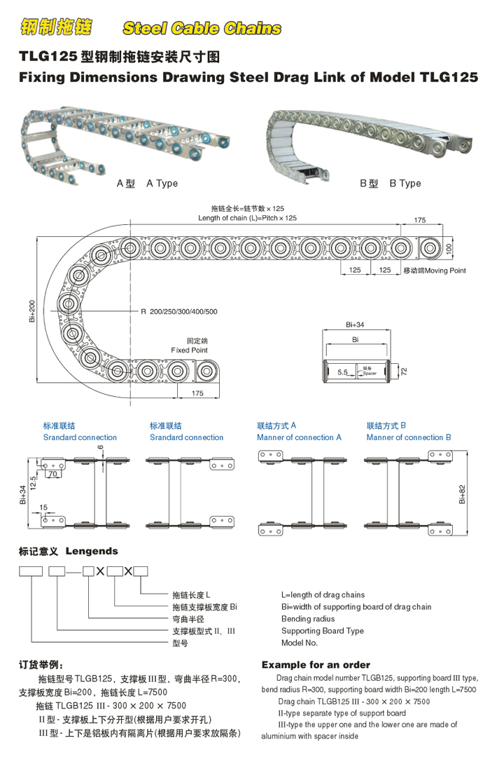 TLG125II型打孔式鋼制拖鏈:簡介:節(jié)距125mm,彎曲半徑有200,250,300,350,470,500,575,.鏈板高度100mm,拖鏈最大打孔75mm。