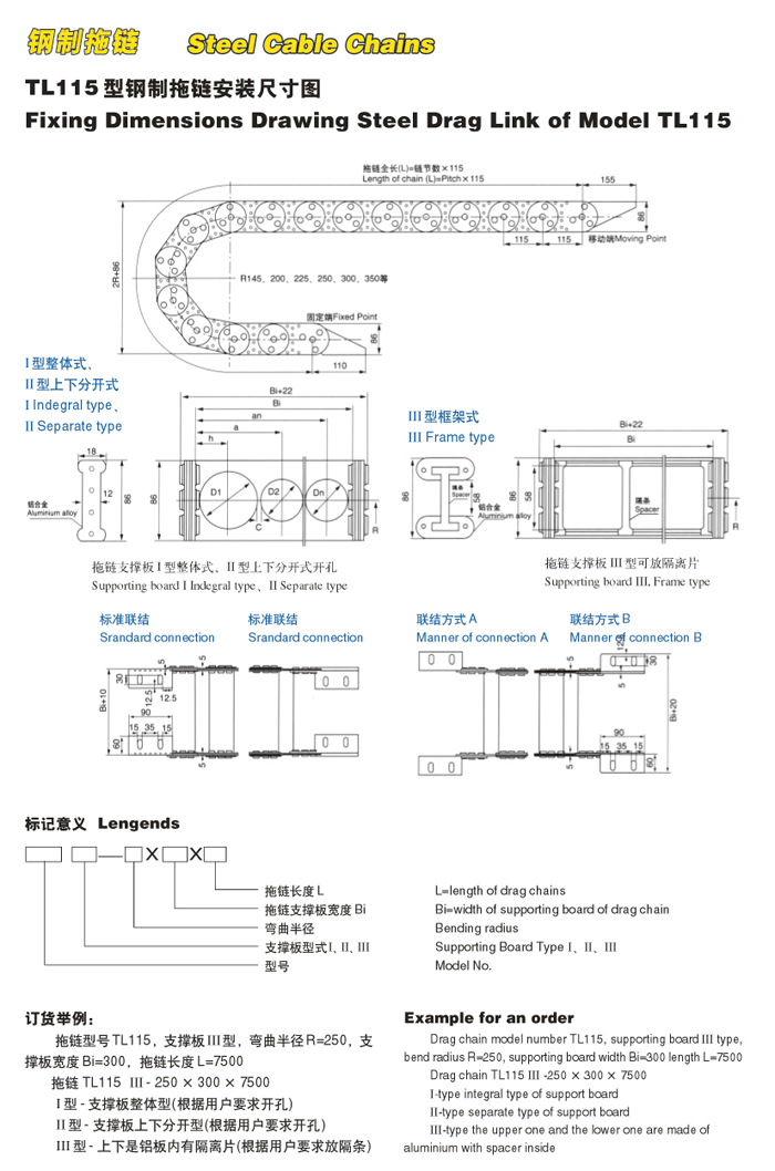 TL115II型鋼制拖鏈:簡(jiǎn)介:節(jié)距115mm,彎曲半徑有145,200,225,250,300.鏈板高度86mm,拖鏈最大孔徑63mm