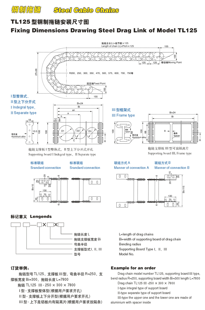 拖鏈型號(hào)TL125,支撐板Ⅲ型,彎曲半徑R=250,支撐板寬度Bi=300,拖鏈長(zhǎng)度L=7800