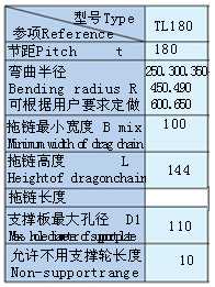 TL180III型鋼制拖鏈:簡介:節(jié)距180mm,彎曲半徑有250,300,350,400,450,500,600,.鏈板高度144mm,拖鏈內徑高度112mm.